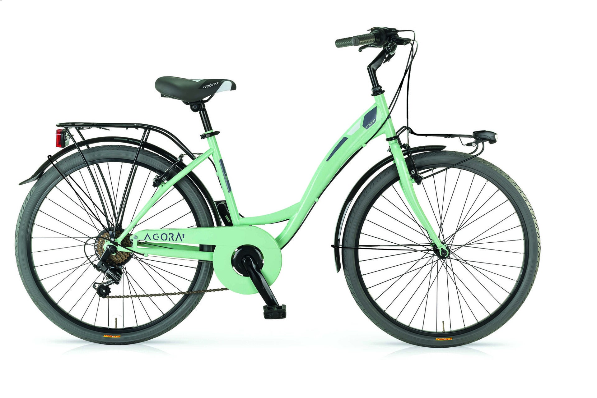 meisjesmodel in monotube-versie, 6 versn. Shimano Revoshift, oversized kader met afgeplatte buizen, alu V-brakes en remgrepen, alu naven, batterijverlichting, pakdrager vooraan.